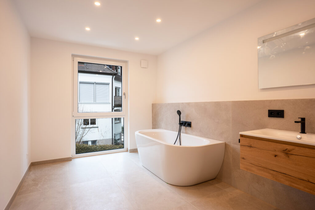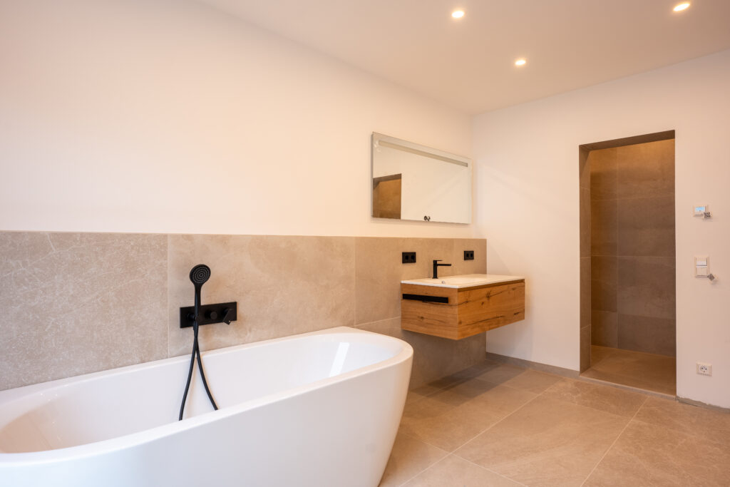 Das moderne Badezimmer ist mit Badewanne und begehbarer Dusche ausgestattet, ergänzt durch zwei zusätzliche WCs.